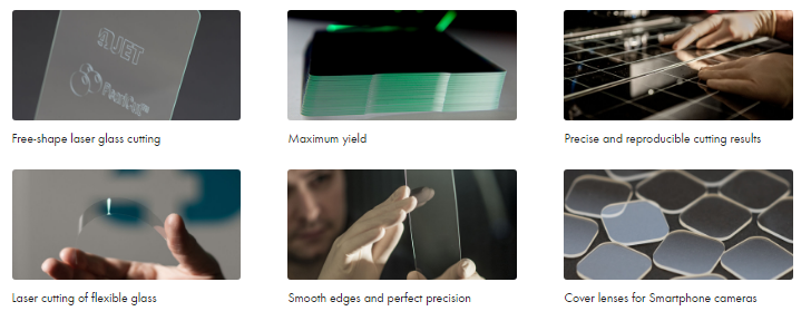 Processable glass types include soda lime and chemically strengthened glass with any ion-exchange depth. In addition brittle transparent materials such as sapphire can also be processed. The PearlCutTM process for laser glass cutting works non-ablative and kerf-free. As a result, no dust is created during the cutting process. The resulting smooth edges ensure high bending strength of the cut parts.